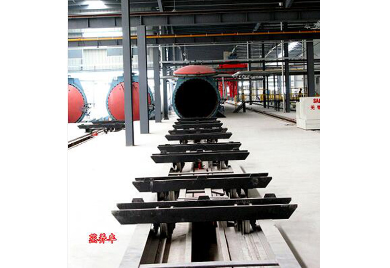 蒸養(yǎng)小車是生產(chǎn)過程中的專用運(yùn)輸車輛,其裝載著切割后的坯體,進(jìn)入蒸壓釜護(hù)養(yǎng)。護(hù)養(yǎng)后,將成品運(yùn)送至成品場地,成品被吊卸后,蒸養(yǎng)車再次載坯體入釜護(hù)養(yǎng)。