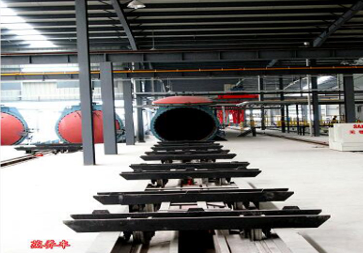 蒸養(yǎng)小車是生產(chǎn)過程中的專用運(yùn)輸車輛,其裝載著切割后的坯體,進(jìn)入蒸壓釜護(hù)養(yǎng)。護(hù)養(yǎng)后,將成品運(yùn)送至成品場地,成品被吊卸后,蒸養(yǎng)車再次載坯體入釜護(hù)養(yǎng)。